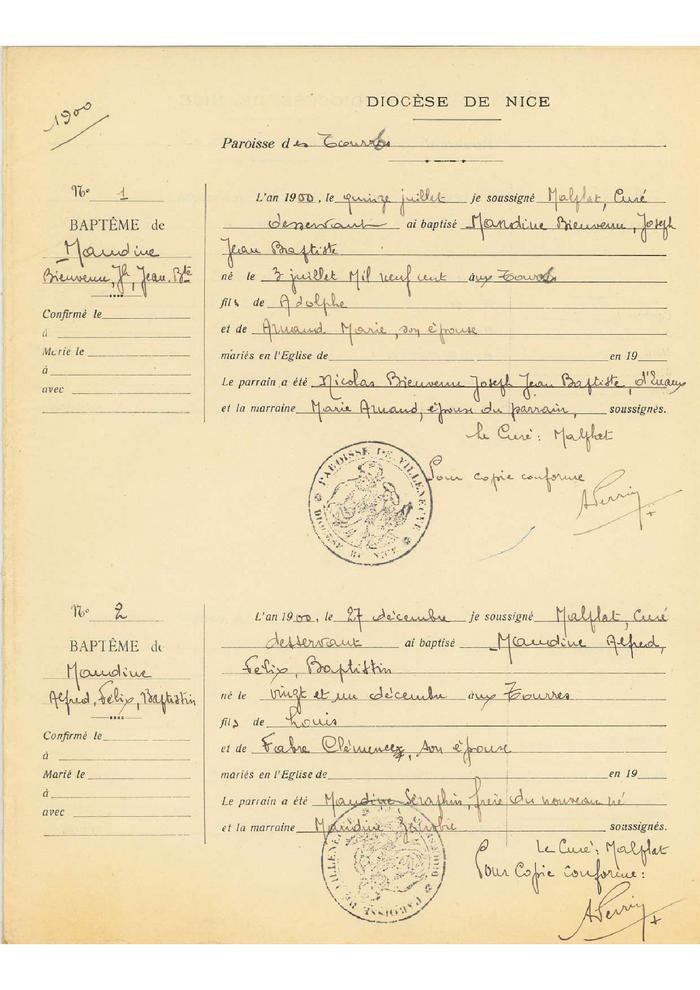 Diocèse de Nice - Paroisse des Tourrès - Registre des actes de baptême [de 1900 à 1910] [Extraits]