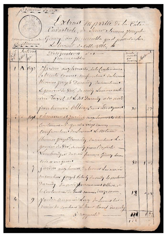 [Extrait en partie de la cote cadastrale du Sieur Simon Joseph Giniey - 1853]