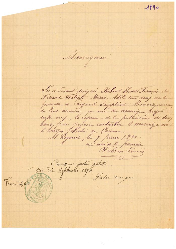 [Demande de dispense de mariage pour François Honoré Ribuot et Félicité Marie-Adèle Ferand]