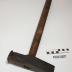 Description : Outil composé d'un manche en bois de section elliptique inséré dans une tête en acier sur plan en gros elliptique, se prolongeant en un gros cylindre (L : 7 cm, D : 4 cm, D de la surface de frappe 4,5 cm), quoique présentant des faces martelées - Manche rustique : L : 52,5 cm, section 3,5 x 2,4 cm. Tête : L : 18,4 cm, Lg 4,3 cm, H : 4 cm.