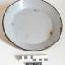 Description : Récipient sur plan circulaire (D à la base 17 cm) , à bords bas et évasés (Ht 2,5 cm ; D au rebord supérieur 24 cm). Le rebord supérieur se recourbe légèrement vers le bas, formant un petit bourrelet (ép 0,5 cm). Les deux faces sont recouvertes d'une couche d'émail de couleur gris-souris