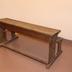 Description : Table banc formant un bloc, dessus incliné avec 3 trous pour le posage des encriers, casier à cahiers et à livres au dessous, banc siège à 3 lames de bois appuyé sur des pieds.