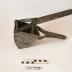 Description : Récipient grillagé à bords latéraux plein en forme de vôute lancéolé prolongé par une poignée à double empattement sur lequel s'articule une seconde poignée comportant le pressoir proprement dit, maintenu par deux pattes métalliques.