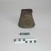 Description : Clochette en bronze moulé à base elliptique (9 x 6,7 cm, H : 9,8 cm), s'amincissant vers le haut (5,4 x 4,3 cm). Battant, constitué d'un clou à tête carré (1,2 x 1,2 cm) dont la pointe a été recourbée en un crochet articulé sur un demi-cercle de métal soudé au fond de la cloche . Anse sup. verticale fixe en fer forgé, de forme elliptique (grand axe parallèle à la base) (L : 5,5 cm, Lg : 1,4 cm, encombrement en H : 1,7 cm). Note de la clochette : SI BEMOL Son très juste.