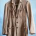 Description : Veste de couleur brun clair. Avec quatre poches sur le devant fermées par un bouton marron. Cintrée à la taille, dans le dos par une ceinture cousue dessus. Col de type "aiglon". Présence de trois boutons marron pour fermer la veste plus une boutonnière sur le haut près du col. Une poche intérieure. Pas de doublure.
