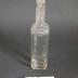 Description : Récipient en verre sur plan carré, bords hauts et droits, goulot sur plan circulaire, long. Renflement à l'extrémité du goulot. Marque en relief.