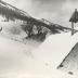 Description : Piste de ski à Allos, skieurs et tire-fesses passant devant la chapelle