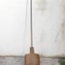 Description : Plaque en bois en trois morceaux assemblés par tenon renforcés par des clous. (D de la plaque 45x39 cm amincie à l'avant et terminée par une autre partie rectangulaire (17x11cm), dans cette partie, une échancrure (20x2,5 cm) sert de logement au manche (L : 308 cm section : 2,5x1,8 cm). Le manche est maintenu dans son logement par des vis et des clous.