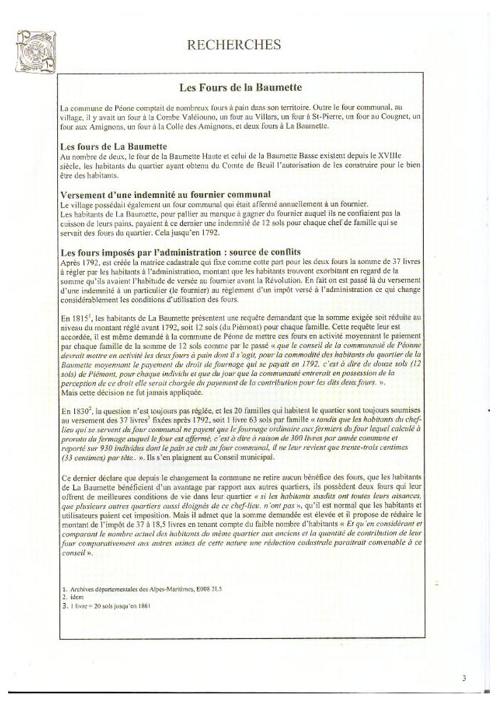 Description : Parmi les nombreux fours que la commune de Péone , le hameau de la Baumette en possédait deux construits avec l'autorisation du Comte de Beuil . N'utilisant pas le four communal, les habitants du hameau payaient une indemnité au fournier communal. Lors de la création de la matrice cadastrale en 1792, l'administration remplaça cette indemnité par un impôt qui fut source de nombreux conflits.