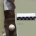 Description : Boule cousue sur une plaque de métal (9x5 cm) entre deux pièces de peau.