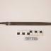 Description : Barre de métal dont la section est un arc de cercle (Lg maxi 1,9 cm) affectant la forme d'une ogive allongée, tronquée à la pointe (Lg : 0,9 cm). Cette partie est striée sur deux faces, la plate et la convexe. Cet outil est par ailleurs doté de la même fine queue triangulaire allongée que les limes plates.