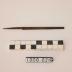 Description : Barre de métal ayant une section triangulaire. La section maxi est de 0,5 cm. Cette section est considérée comme la "base" de l'outil, de laquelle part, d'un côté, un tétraèdre très allongé, tronqué (section à l'extrémité 0,35 cm), sur les trois faces duquel sont gravées des stries. De l'autre côté de la base, à 180° de ce tétraèdre, part une pyramide régulière à base hexagonale, très effilée : il s'agit de la queue, que l'on peut introduire dans l'orifice d'un manche en bois. L partie striée : 7,7 cm.