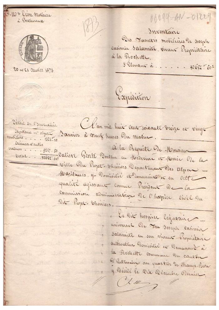 Inventaire des facultés mobilières de Joseph Casimir Salamite - Entrevaux 1873