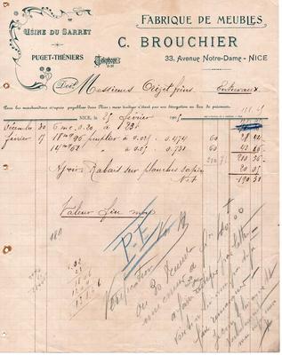 Facture - Fabrique de meubles C. Brouchier - Usine du Sarret - Puget-Théniers - 1905