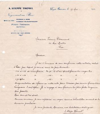 Correspondance de l'entreprise A. Steppe Thomel, négociant en bois à Puget-Théniers à Firmin Déramond - 1923.