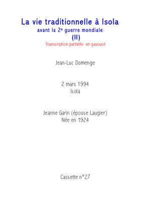La vie traditionnelle à Isola avant la 2e guerre mondiale (II) TRANSCRIPTION partielle - cassette n°27 (partie 1 et 2)