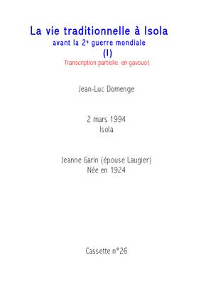 La vie traditionnelle à Isola avant la 2e guerre mondiale (I) TRANSCRIPTION partielle - cassette n°26 (partie 1 et 2)