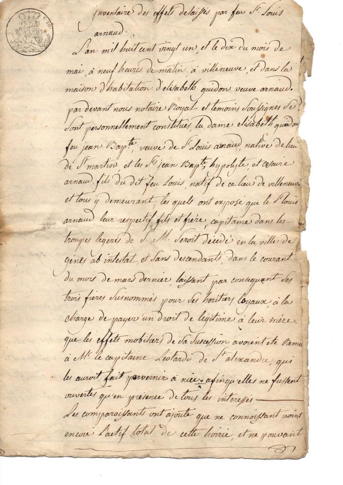 Inventaire des effets délaissés par feu Louis Arnaud - 1821