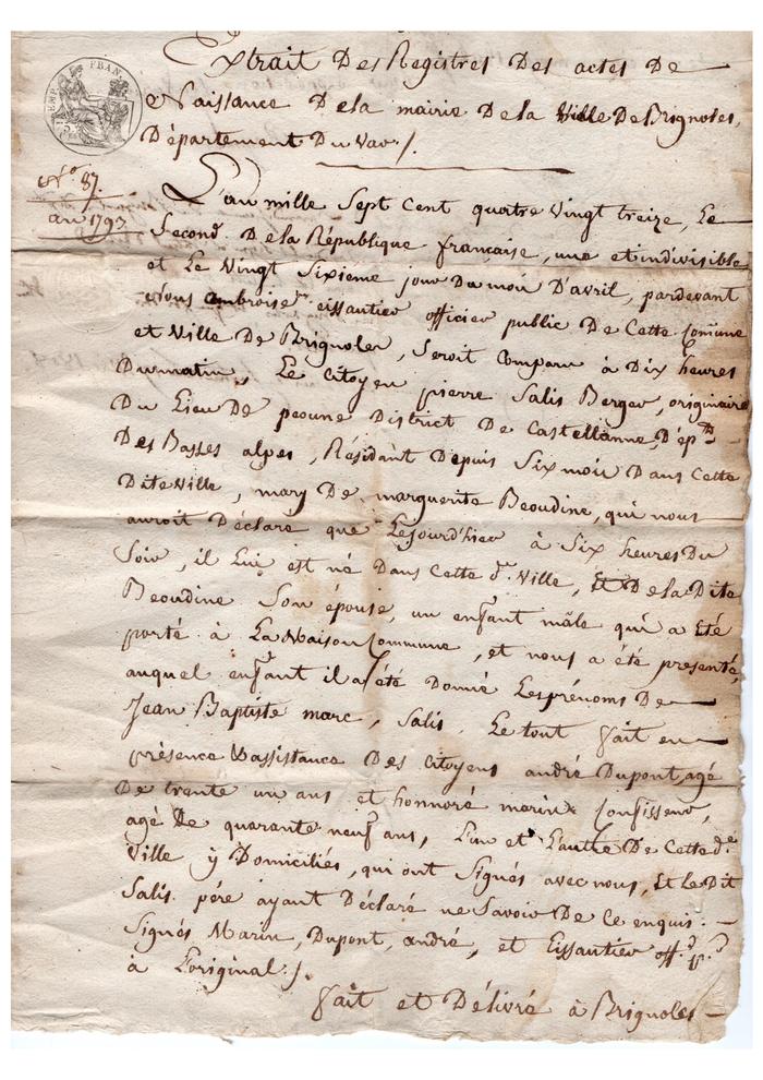 [Acte de naissance de Jean-Baptiste Salicis dit Roux - 1793]