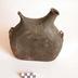 Description : Récipient sur plan elliptique (21,5 x 7,5 cm) à bords galbés pour les deux petites faces, et droits pour les grandes. Au sommet du récipient s'ouvre un bec goulot, long de 5cm (D 3,5 cm), incliné de 45° vers l'extérieur. Cet orifice sert au remplissage du récipient. De l'autre côté, pointe un second bec-goulot plus fin, allant s'étrecissant (L 4cm; D 1;1 cm), incliné symétriquement dans un autre sens et pourvu d'un petit bouchon de bois. Cet orifice permet de boire à la "régalade". Le récipient présente sur ses deux faces latérales , deux anses mobiles horizontale qui tiennent lieu de passants pour une corde ou une lanière.