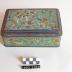 Description : Boîte de section rectangulaire à bords moyens droits et couvercle légèrement bombé, animée d'un décor en relief obtenu par emboutissage de rinceaux, guirlandes florales et oiseaux.