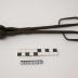 Longues branches à anneaux ovoïdes, croisées et rivées ; mors plats circulaires à tête demi-sphérique.