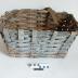 Description : Corbeille en éclisses tressées et peinte extérieurement en gris. La forme générale est une pyramide tronquée. L'inclinaison des parois est faible. La corbeille est munie d'une courroie tressée reliant les deux parois latérales les plus éloignées.