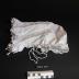 Description : Coiffe dont la bordure est cousue avec une guêpière blanche brodée de motifs différents. Celle de devant est très froncée et double sur le dessus de la tête. A la base du bonnet coulisse un cordonnet qui permet de l'ajuster à la tête et d'enserrer les cheveux. Devant, deux lacets plats se nouent sous le cou pour tenir le bonnet sur la tête.