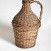 Bouteille en verre teinté de base circulaire diamètre 13 cm à bords droits s'évasant vers le haut puis se rétrécissant jusqu'à former un goulot. Elle est entourée de rotin fendu tressé autour d'osiers verticaux. Une anse en rotins enroulés. Un bouchon de liège.