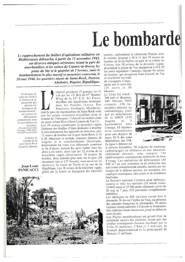Description : Evocation du bombardement meurtrier du 26 mai 1944 sur les quartier niçois de St Roch, Pasteur, Abattoirs, Riquier, République