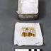 lot de six ampoules de morphine d'un centigramme. les ampoules sont stockées dans une boîte métallique de plan carrée. (8,2 x 8,2cm)