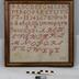 Description : abécédaire comprenant l'alphabet brodé en rouge sur toile blanche. L'abécédaire est conservé dans un cadre doré.