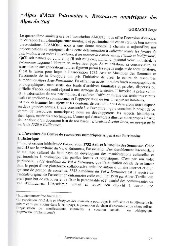 Description : La 1ère partie de cet article porte sur la génèse de la création du Centre de ressources numériques "Alpes Azur Patrimoine"1, projet porté par l'association 1732 Arts et Musiques des Sommets 2 en partenariat avec Roudoule, Ecomusée en terre gavotte 3.